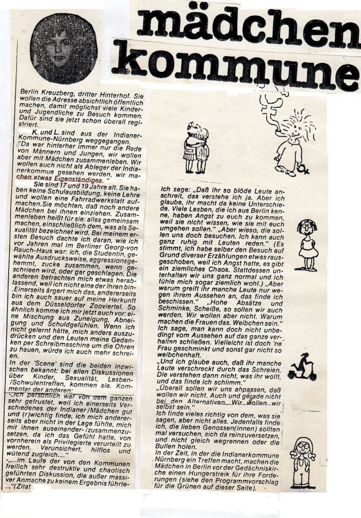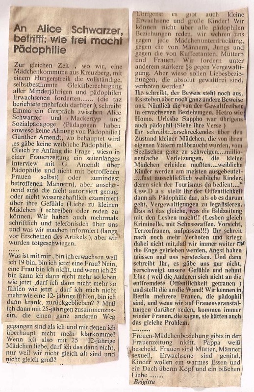 »Fast alle Frauen, die zärtliche und sexuelle Gefühle für Kinder haben, fürchten sich davor, ihren Wünschen und Bedürfnissen nachzugeben und auf diejenigen der Kinder einzugehen, weil diese Beziehungen legal verfolgt werden und ihre sozialtherapeutische Natur zerstört wird. Fast allen gegenwärtigen Kampagnen, die angeblich gegen „sexuellen Missbrauch“ gerichtet sind, geht es nur um die Straffung der konventionellen Moral, die Unterdrückung unserer Sexualität und um die Kontrolle der Kinder. Durch eine Haltung wie in Isolationshaft gelingt es, das Mädchen davon abzuhalten, sexuelle Erfahrungen zu machen, selber etwas auszuprobieren, um heraus zu finden, was sie gern hat und was nicht. Stattdessen werden ihr komplett fremde Wünsche übergestülpt, angeblich nur, um sie zu schützen.«