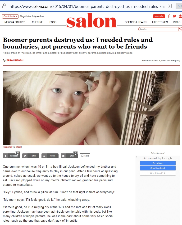 »Wenn es sich gut anfühlt, dann tu es: ein Schlachtruf der 60er Jahre, und die Wurzel von viel wirklich schlechter Elternschaft. Jackson mag sich mit seinem Körper bewundernswert gut gefühlt haben. Aber wie viele Kinder von Hippie Eltern war er im Unklaren über einige sehr grundlegende soziale Regeln, wie zum Beispiel die, welche besagt, hol dir keinen runter in der Öffentlichkeit.«