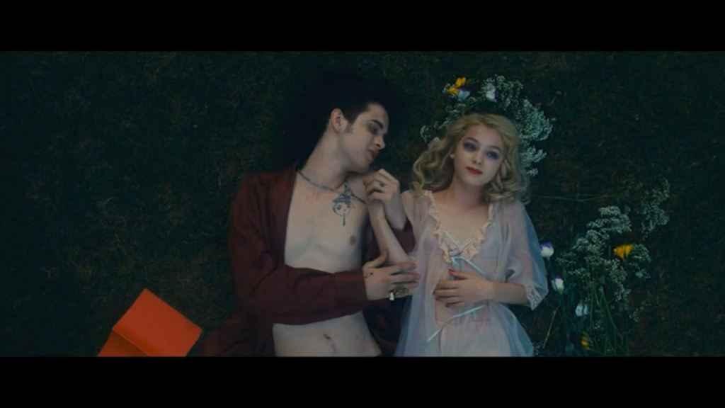 In der folgenden Nacht schleicht sich Violetta nachts aus dem Zimmer, das sie mit ihrer Mutter teilt, und spaziert im Négligé vor den jungen Mann, der darauf gewartet hat, um sie das Opium-Rauchen zu lehren. Violetta gleitet dabei wie von selber auf seinen Schoss. Die Fortsetzung bildet dann eine Kussszene zwischen Liegenden unter dem Nachthimmel. Violetta reagiert dabei ungehemmter denn am nächsten Tag, als sie vor der mütterlichen Kamera eine analoge Szene spielen muss. Dass Regisseurin Eva das so inszeniert, sagt einiges aus. Dann liegen sie spärlich bekleidet eng aneinander geschmiegt, Hand in Hand, und betreiben das Augenspiel von jungen Leuten, die sich gerade gefunden haben. Freunde des Dandy erzeugen dazu Stimmung mit psychedelischer Musik. Den Fortgang des Tête à tête in die Nacht hinein lässt die Regisseurin so erfassen, dass Violetta optisch hinter dem Rücken des Dandy verschwindet. Einer der ganz wenigen Momente, wo die Regie die interessierenden Details der Phantasie des Betrachters überlässt.