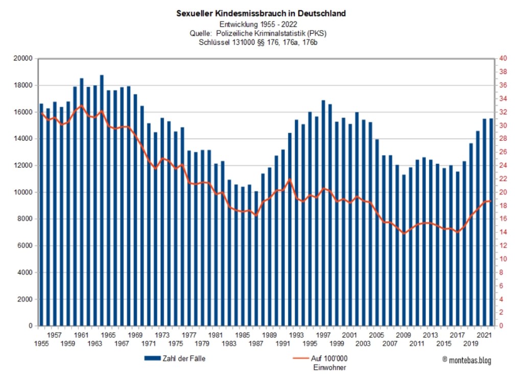 In den Verlautbarungen aus offizieller Quelle über die Datenlage und in der ständig geleisteten Bewusstseinsarbeit zum Thema SKM wird aber meistens nur von dem – nicht zu leugnenden – Anstieg seit 2017 gesprochen, und die Medien übernehmen diese Optik. Sie unterstützen diesen Eindruck oft auch noch dadurch, dass sie etwa ein Interview mit der Leiterin einer lokalen Beratungsstelle wiedergeben, welche über steigende Zahlen klagt (was auch einfach auf gestiegene Sensibilität und Anzeigebereitschaft hinweisen kann, aber so meistens nicht gesagt wird).