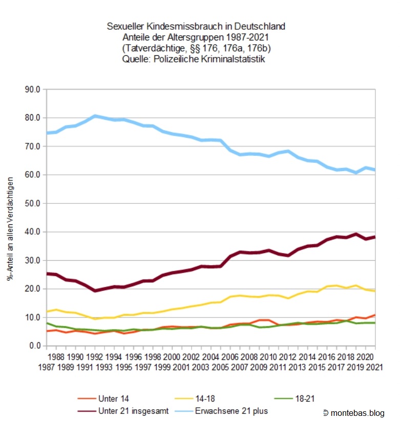 In der Grafik oben wiedergibt die blaue Linie den Prozentanteil der Erwachsenen (ab 21), die braune den Anteil der unter 21Jährigen (‚zusammen ‚blau‘ + ‚braun‘ = 100 Prozent). Die Verlagerung der Aktivitäten von den Erwachsenen zu den Jugendlichen ist offensichtlich. Dies gilt, obwohl die Gruppe der Jugendlichen nur 21 Jahrgänge umfasst (effektiv wohl nur rund 10, nämlich jene zwischen ungefähr 11 und < 21), während der grosse Rest effektiv mindestens 40-50 Jahrgänge einschliesst. Kommt dazu, dass im erfassten Zeitraum der Anteil der Jugendlichen an der Gesamtbevölkerung abgenommen hat, während vor allem jener der über 65jährigen gestiegen ist. Das verschlimmert das Bild zusätzlich. Der Anteil der des Missbrauchs verdächtigen Jugendlichen reichte 2019 nahe an die 40% heran (39.2% )!