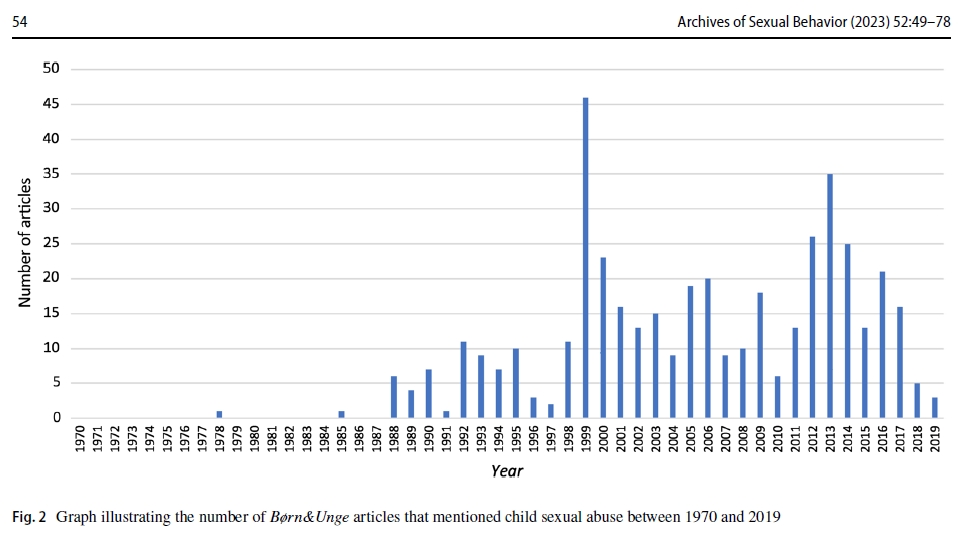 Von 1970 bis 1985 gab es in B&U nur zwei Artikel über CSA [Child Sexual Abuse]. Dieses Zeichen der Absenz des CSA-Themas wird durch den Inhalt der Artikel bestätigt. Der erste war ein Bericht eines dänischen Kinderarztes vom Zweiten Internationalen Kongress über Kindesmisshandlung und Vernachlässigung in London im Jahr 1978. Es wird erklärt, dass man erst in letzter Zeit zunehmend auf CSA aufmerksam geworden sei, sowohl in Europa als auch in den USA, und dass die meisten Redner über CSA auf dem Kongress Amerikaner waren. So argumentierte ein amerikanischer Redner, dass mindestens eines von vier Kindern mindestens einen sexuellen Übergriff vor seinem achtzehnten Lebensjahr erlebt. Der Bericht des Kinderarztes stützt somit das Argument, dass die große Aufmerksamkeit auf CSA in den Vereinigten Staaten Ende der 1970er Jahre begann und in den 1980er Jahren nach Europa exportiert wurde. Dies wird auch durch den zweiten Artikel über CSA aus diesem Zeitraum betätigt, eine Rezension eines amerikanischen Kinderbuchs aus dem Jahr 1985, das Kinder ermutigt, sich einem Erwachsenen anzuvertrauen, wenn sie sexuellen Missbrauch oder andere Verletzungen der persönlichen Grenzen durch Erwachsene oder ältere Kinder erfahren. Mitte der 1980er Jahre war sexueller Missbrauch von Kindern ein Thema, das in Dänemark überhaupt nicht existierte, und die Zählung der B&U-Artikel, die die CSA zwischen 1970 und 2019 erwähnten, bestätigt, dass die B&U erst im Jahr 1988 begann, regelmäßiger über CSA zu schreiben (Abb. 2).