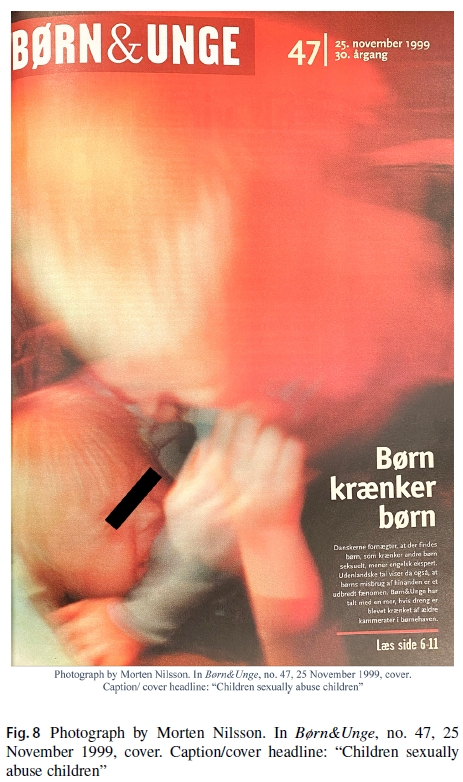 Bereits 1999 publizierte B&J eine dreiteilige Artikelserie über kindliche Sexualität. Ein Blick genügt, um festzustellen, dass wir eine neue Periode betreten haben. Vorbei waren die glücklichen, nackten Kinder. Das Titelbild zeigte ein unscharfes Foto der Köpfe und Armen von zwei kämpfenden Kindern (Fig. 8). Ein Kopf war doppelt so groß wie der des anderen, und das kleinere Kind war in großer Not und weinte mit geschlossenen Augen. Der Kopf des kindlichen Angreifers war so groß und verschwommen, dass er dämonisch aussah. Die Schlagzeile erklärte ausdrücklich, was vor sich ging: „Kinder missbrauchen Kinder.“ Der Aufmacher fügte hinzu, dass dies ein weit verbreitetes Phänomen sei, obwohl es in Dänemark geleugnet werde.